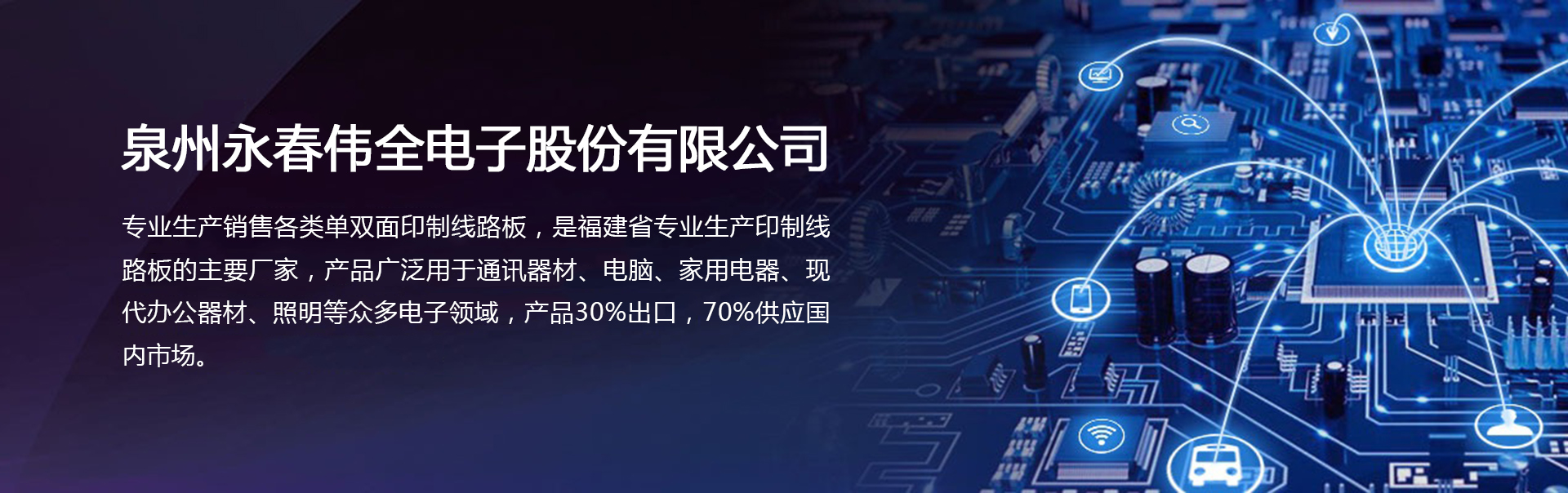 泉州永春偉全電子股份有限公司是一家合資企業。創辦于2011年,專業生產各類單面印制線路板,是福建省專業生產印制線路板的主要廠家,公司坐落在泉州市永春縣桃城鎮留安開發區添福工業園,占地面積達10多畝,交通方便。公司現有員工80多人,總投資3000多萬元人民幣,年生產能力逾20萬平方米。